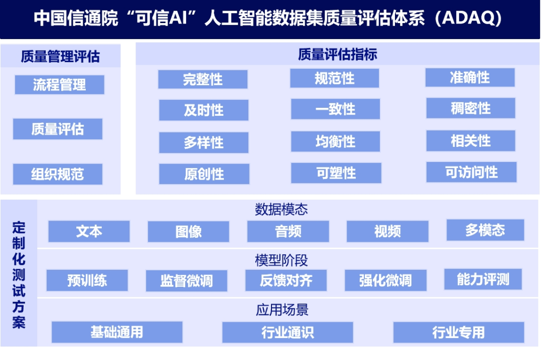 2024年12月,中国信通院人工智能研究所正式发布 “可信AI”人工智能数据集质量评估体系(ADAQ,Artificial intelligence DAtasets—Quality evaluation),开发建设人工智能数据集质量评估工具平台1.0,搭建“1个标准化方法+1个质量评估平台+1套标准化服务流程+N项定制化质量评估方案”的质量评估能力,面向通用基础数据集、行业通识类数据集和行业专用类数据集等三大类数据集提供标准化数据集质量评估测试服务。