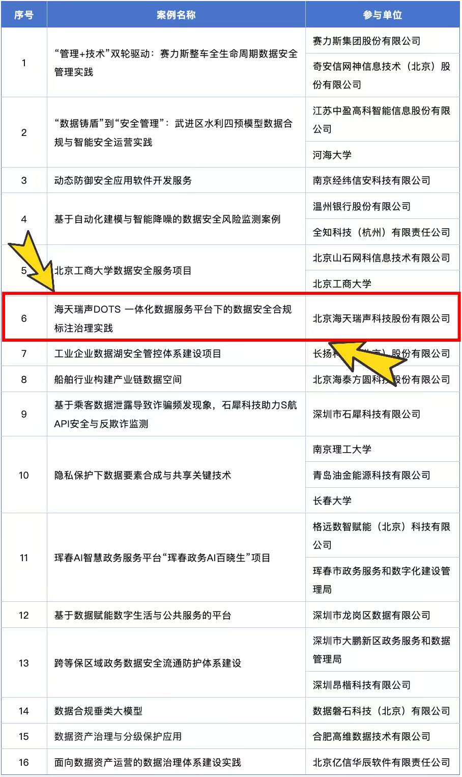 本次脱颖而出的16个优秀案例,展现了各行业在数据安全合规领域的深耕细作与创新突破,案例各具特色、排名顺序不分先后。其中,海天瑞声的数据安全合规标注治理实践,以数据全生命周期为核心,通过构建覆盖数据采集、标注、存储、使用与流转的合规治理机制,实现了安全管控与业务效率的协同提升,充分展现了高质量数据治理的标杆价值。